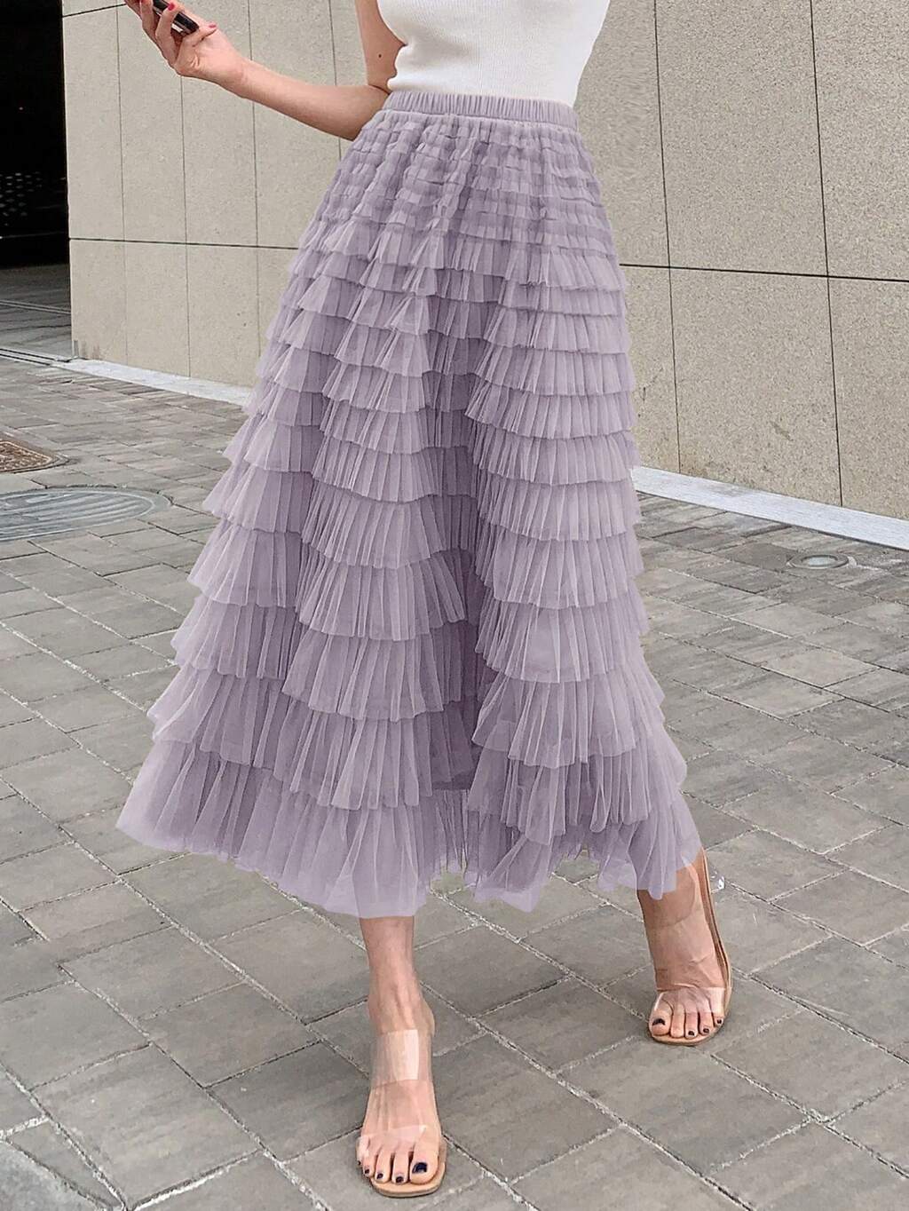 Solid Layer Ruffle Hem Mesh Skirt