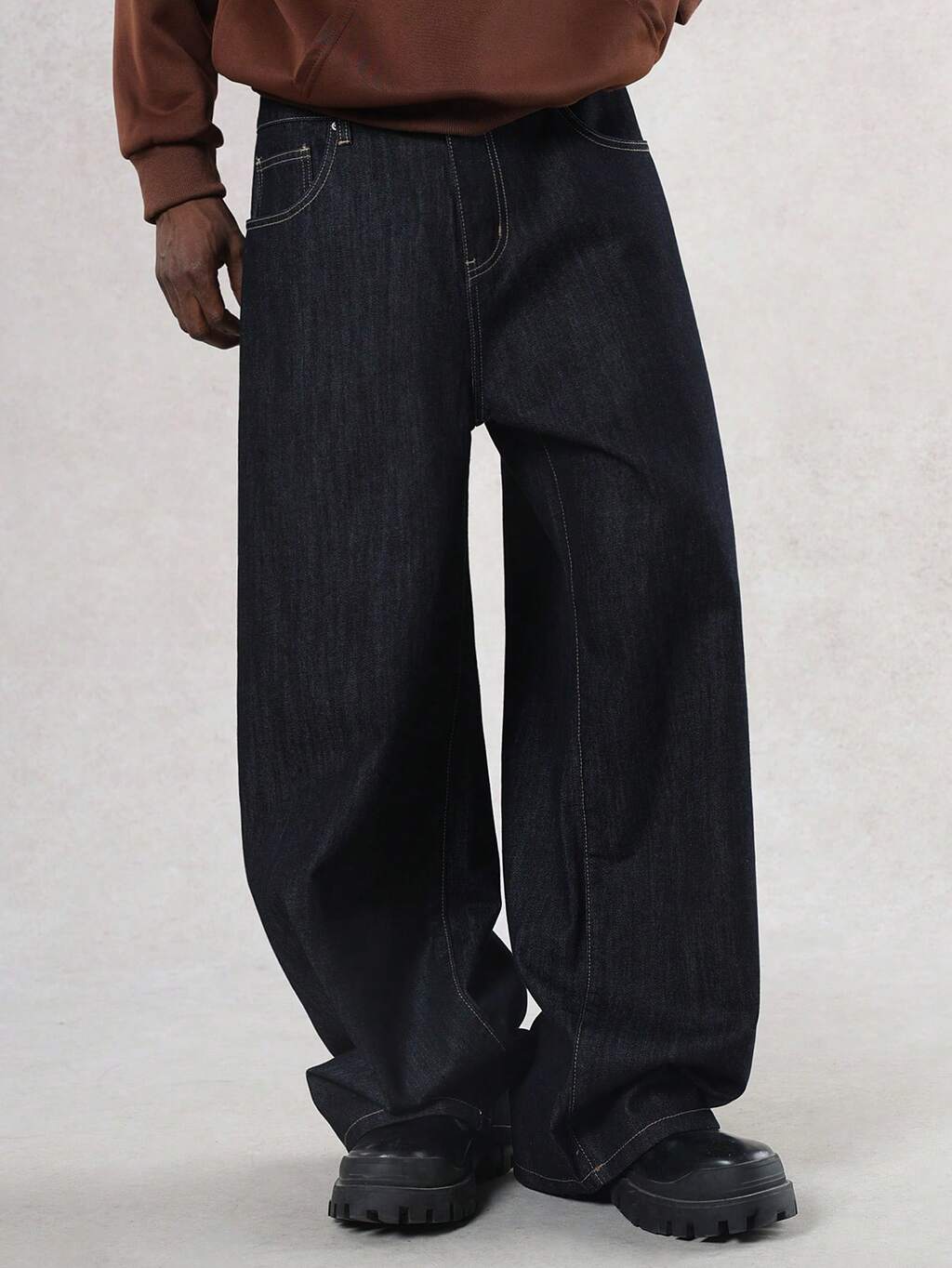 Men's Letter Print Embroidery Design Raw Navy Blue Blue Denim Jeans, Autumn