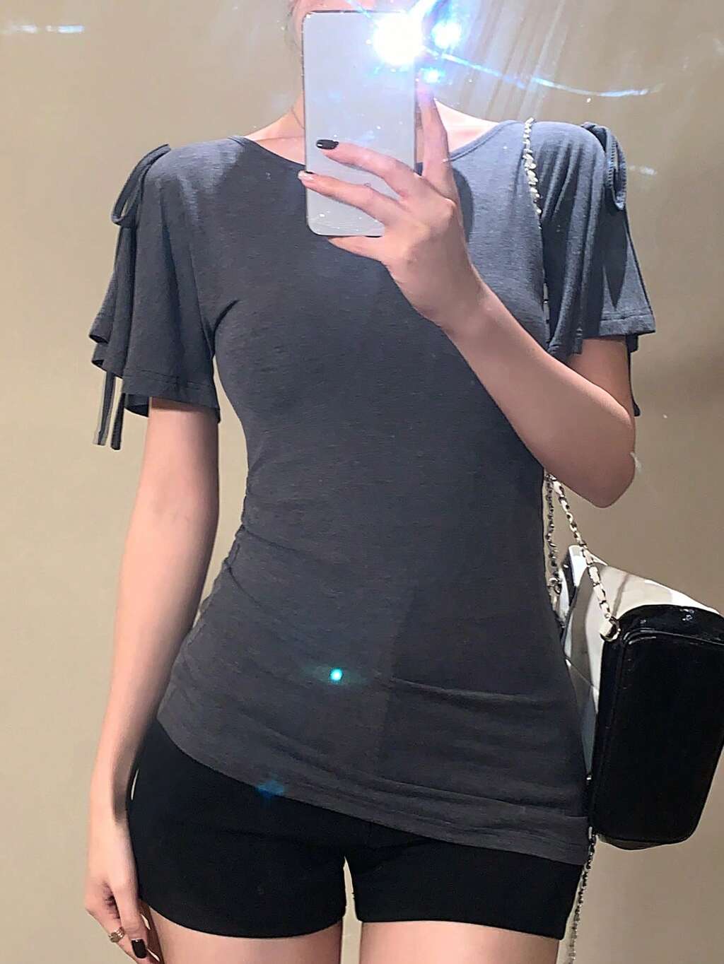 Damen Gerafftes Bindeband Vorne Sommer T-Shirt Frühling