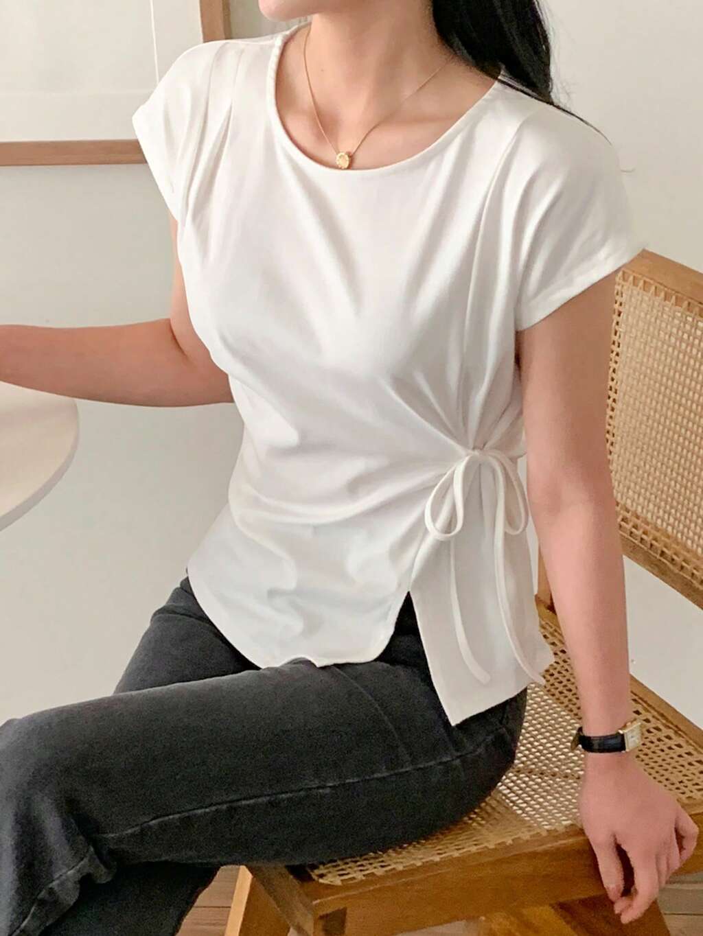 Damen Rundhals Tailliert Binden Weißes T-Shirt Sommer