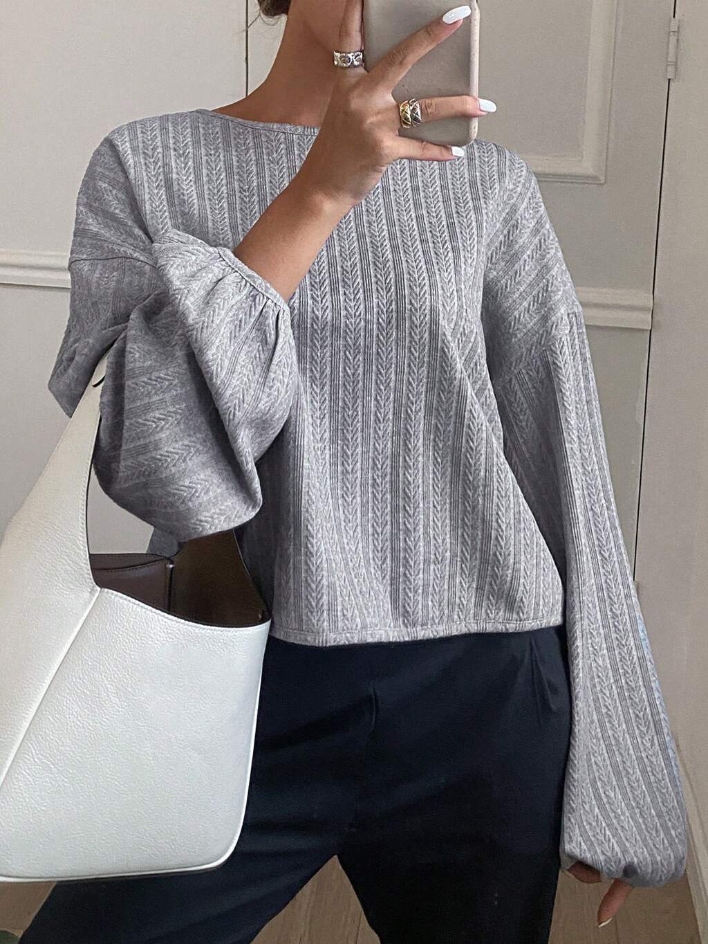 Strukturiertes, lässiges Rundhals-T-Shirt für Frauen, Langarm Damen Tops