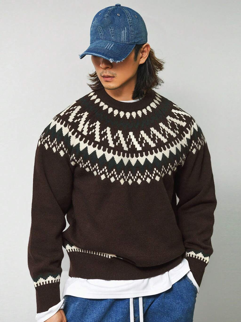 Herren Vintage Muster Jacquard Dicker Rundhals Pullover, Herbst/Winter
