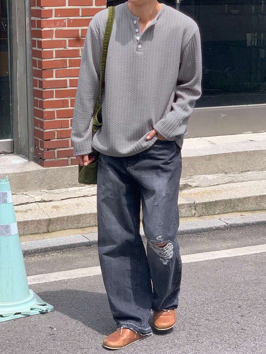 Textur Stoff Teilweise Knopfleiste Grau Herren T-Shirt, geeignet für Frühling und Herbst