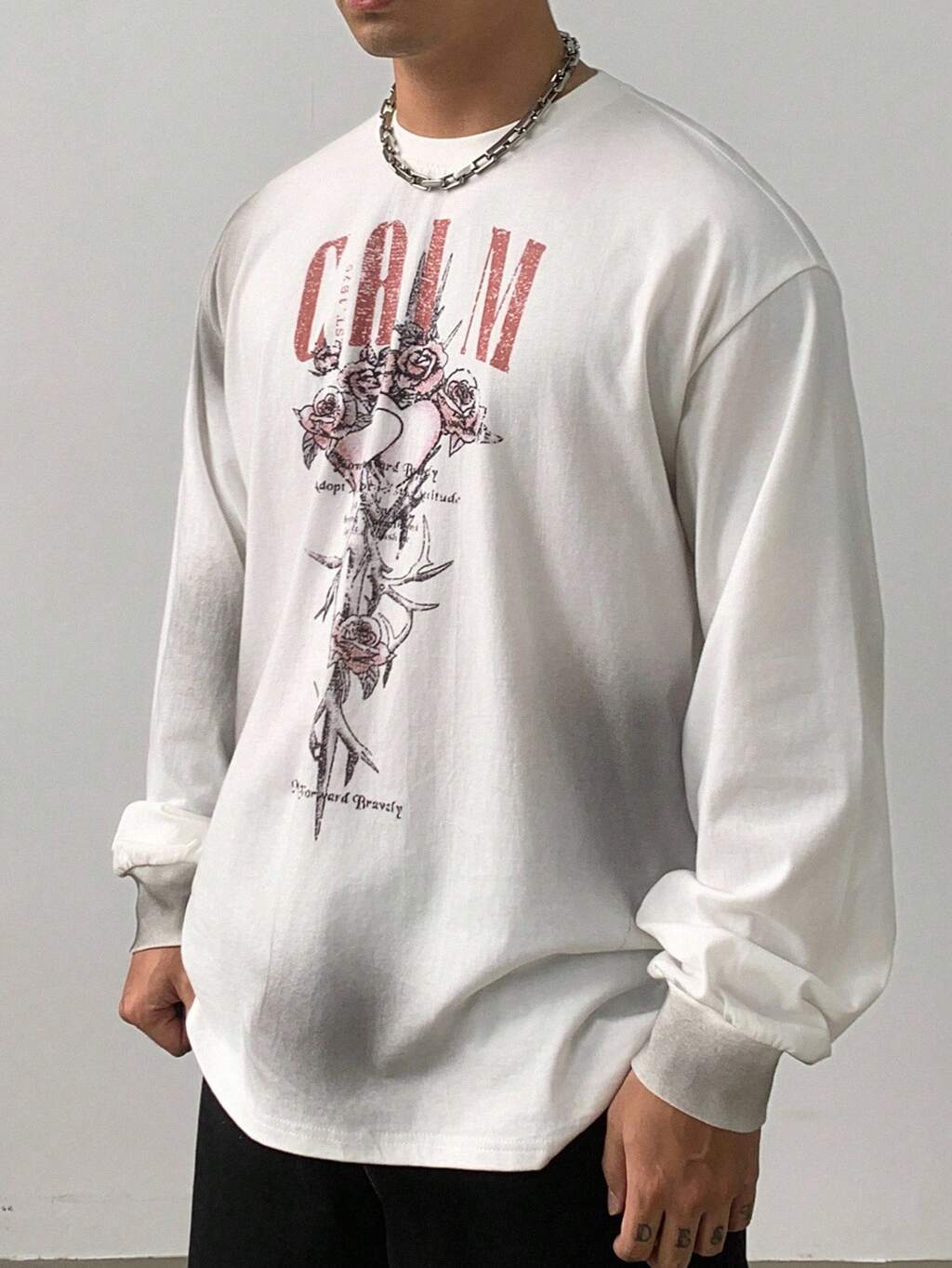 Herbst Vintage Buchstaben Muster Street Goth Stil Weißes Langarm T-Shirt für Herren