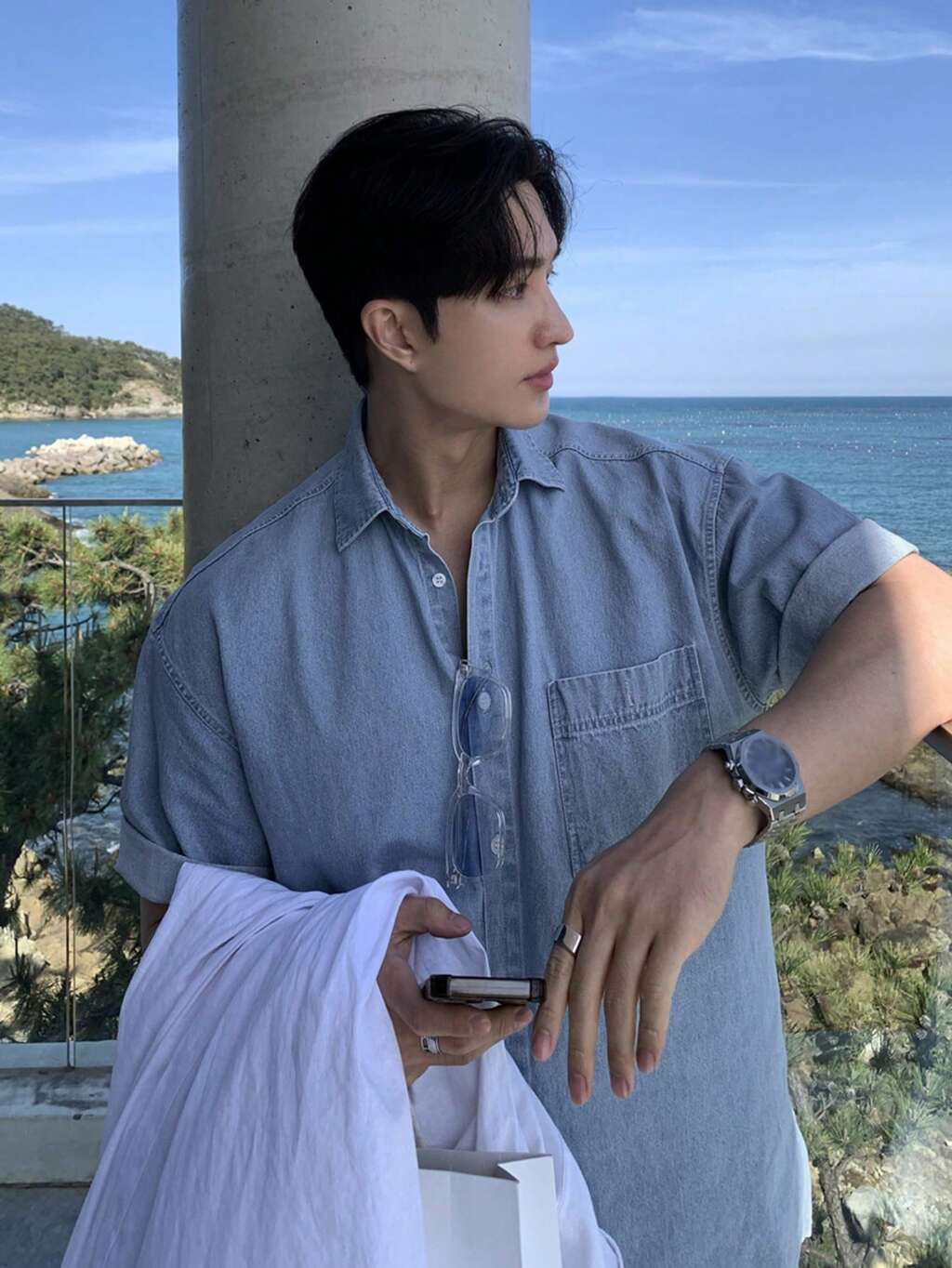 Verwaschendes blaues Jeanshemd mit Kurzarm für Herren im Sommer