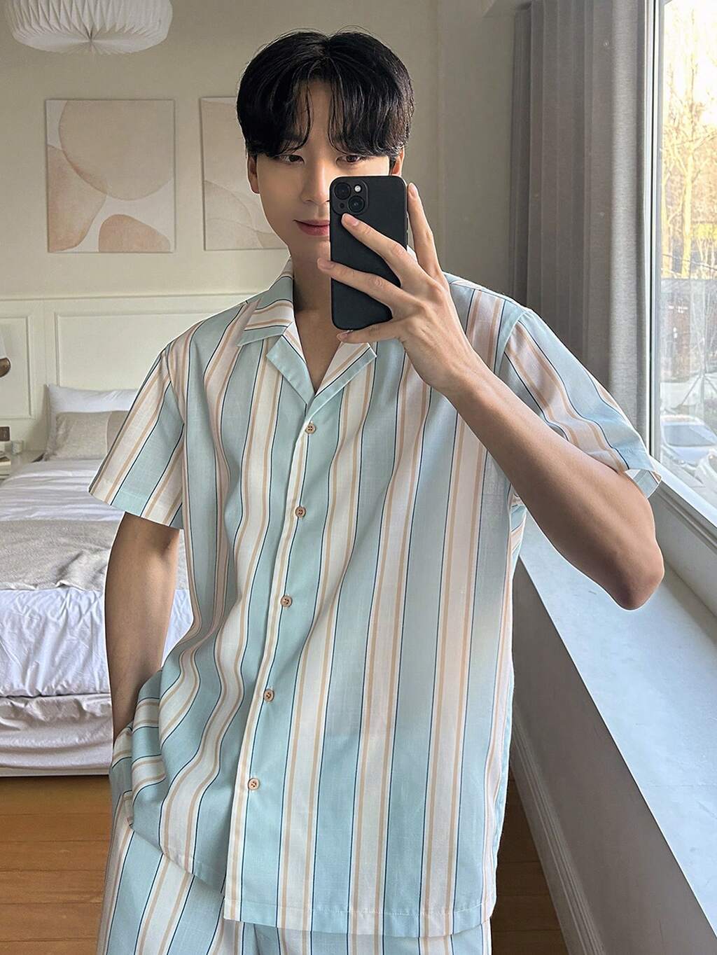 Herren Sommer Kurzarm Hemd und Shorts gestreifter Pyjama Set