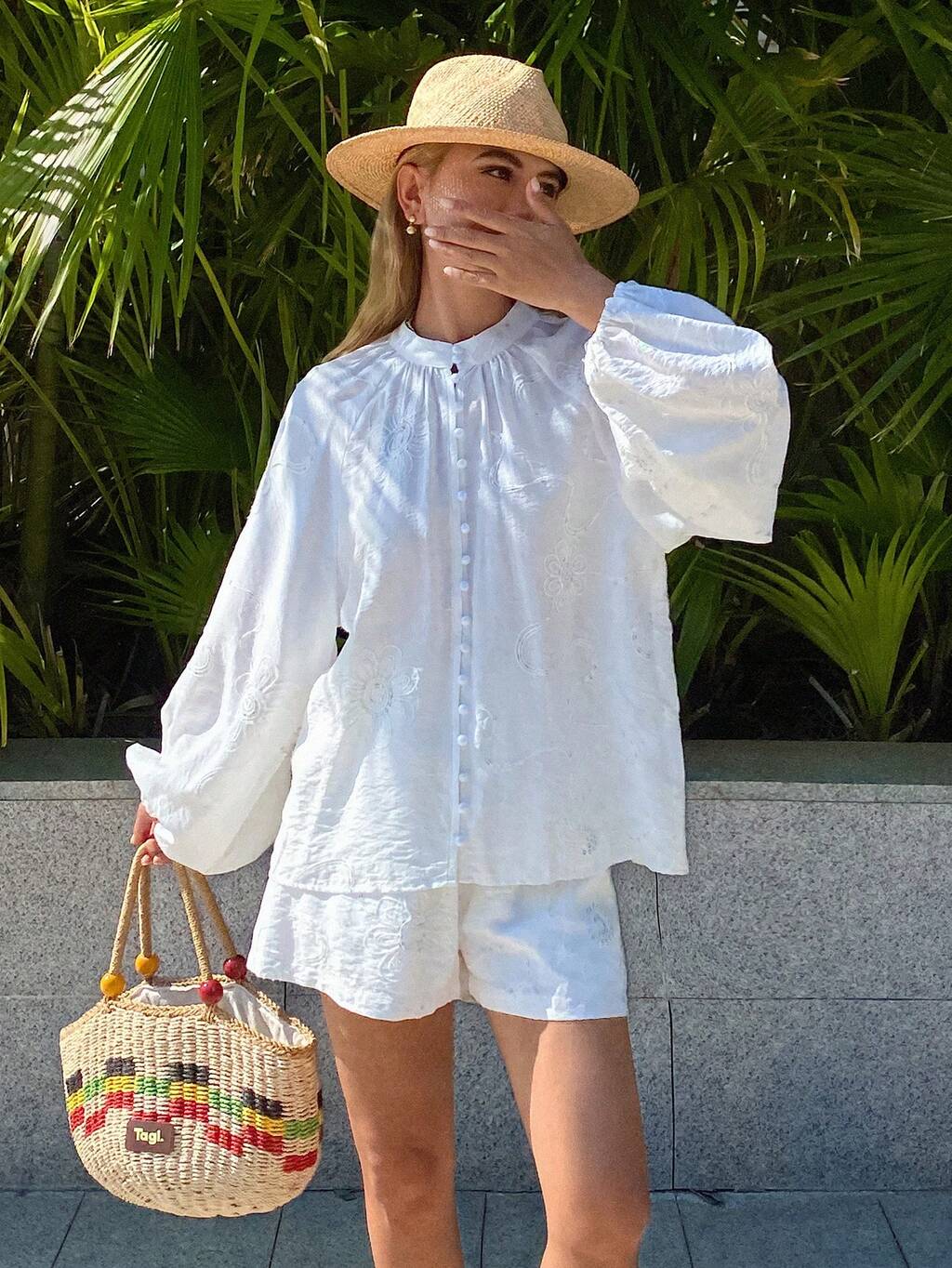 Damen Mandarinkragen Einreiher Blumenstickerei Muster Laternärmel Top und Shorts Lässig Urlaubs 2-teiliges Set