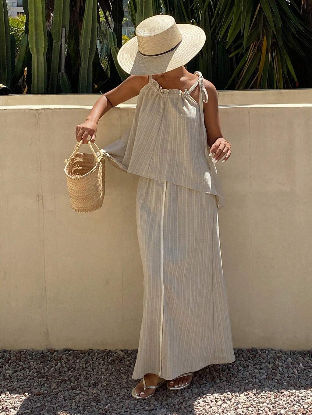 Damen Sommer gestreiftes Neckholder-Top mit Bindedetail und gerade geschnittene Hose, 2-teiliges Urlaubsset