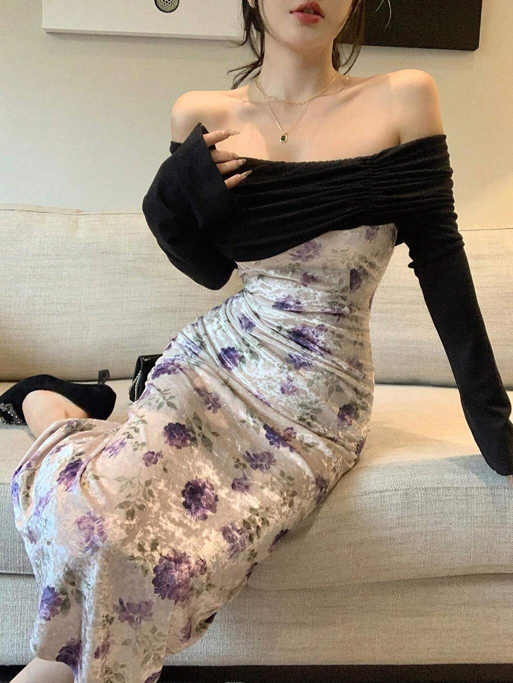 Farbblockfreies Schulterkleid für Damen, Geburtstags-Abendkleid, Herbstkleidung Langarmkleid Elegante Damenkleider, Blumenkleider für Damen