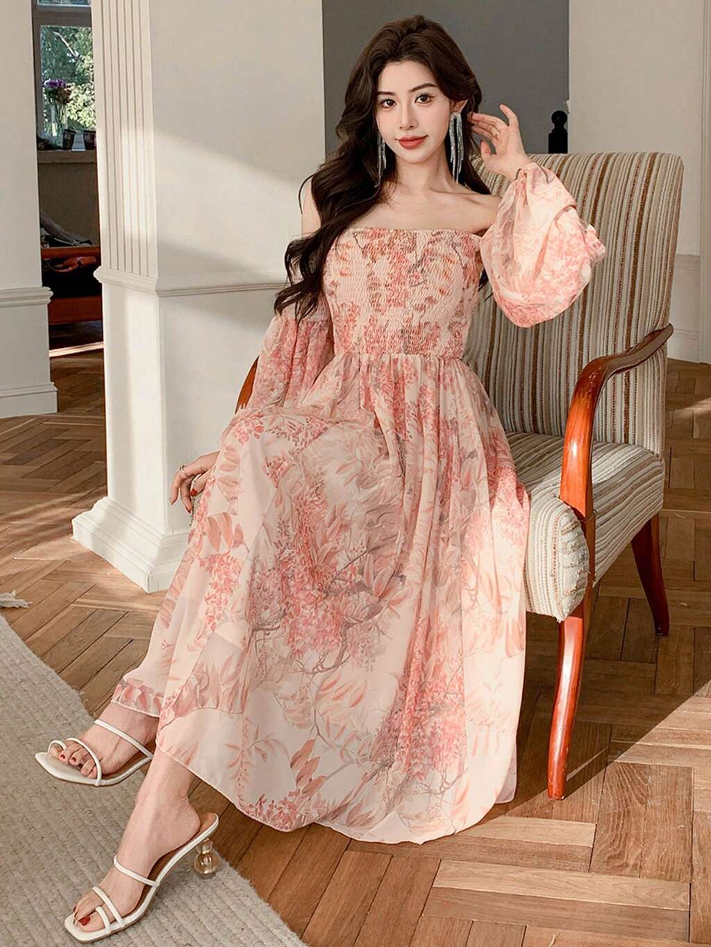Midi-Kleid mit Blume Muster für Damen mit Schulterausschnitt, Milchmädchen-Kleid, Herbstkleid mit langen Ärmeln, Boho-Stil