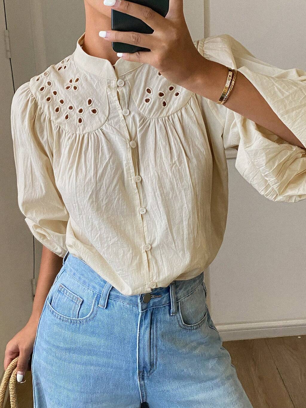 Französische Bluse mit Hohlmuster-Spitze, elegante und einzigartige Damenblusen mit Langarm