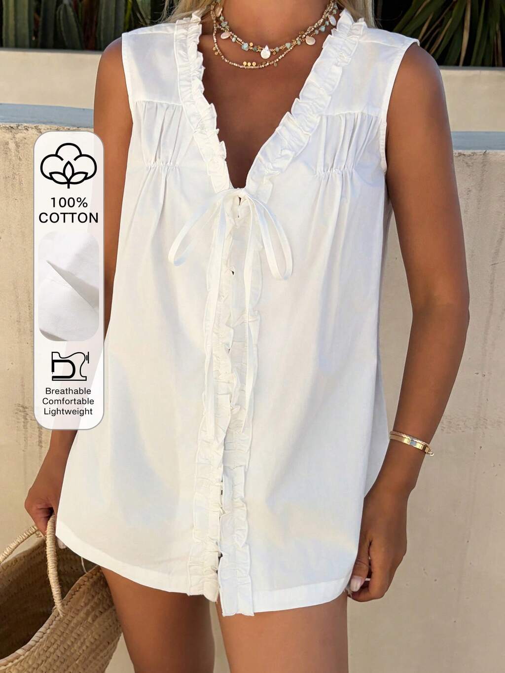 Damen Sommer V-Ausschnitt ärmellose Rüschen Saum Schleife Lässig Pullover Bluse