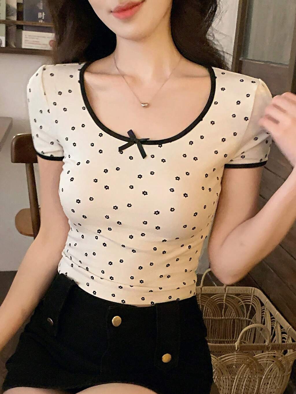 Damen Sommer T-Shirt mit Rundhalsausschnitt, Kurzarm, Schleifen-Dekor und Muster, Lässig