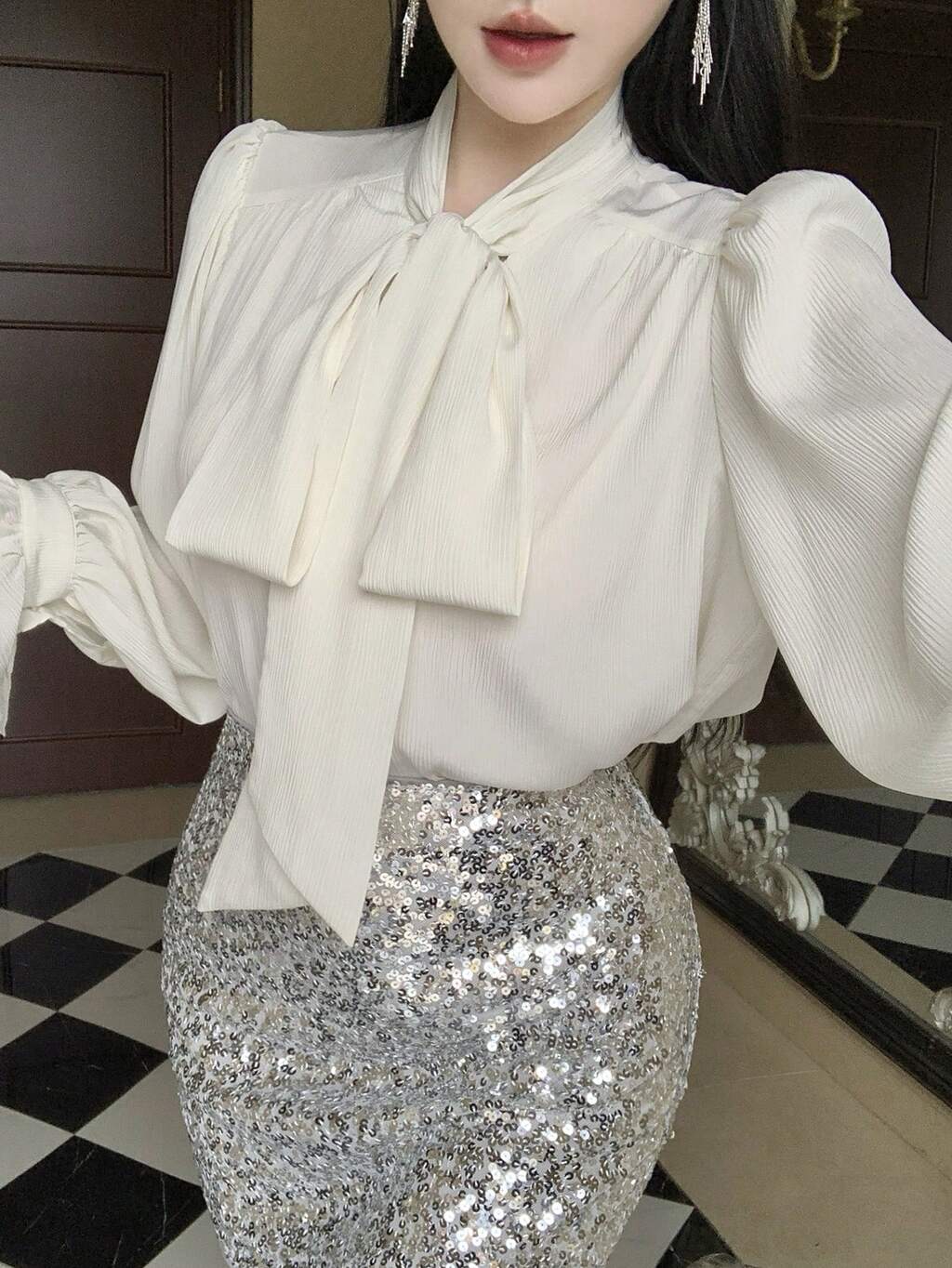 Damen Farbblock Schleifenkragen Bluse mit Ballonärmeln, Rüschen Langarm Damen Top