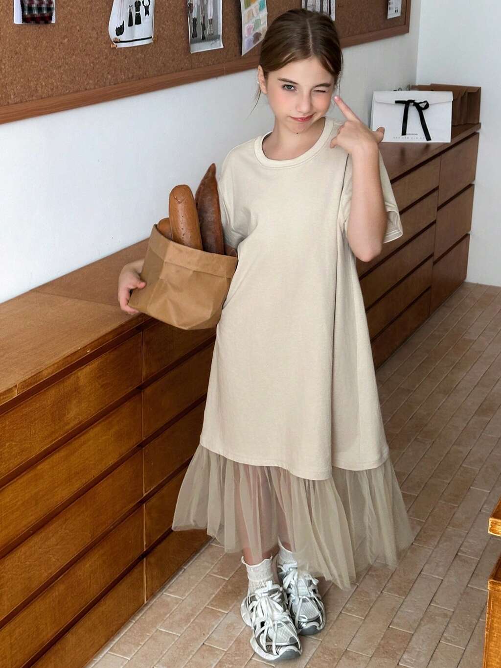 Mädchen Midirippröhrchen Strick Kurzarm Mesh Patchwork Kleid, Sommer, Schulanfangskleidung