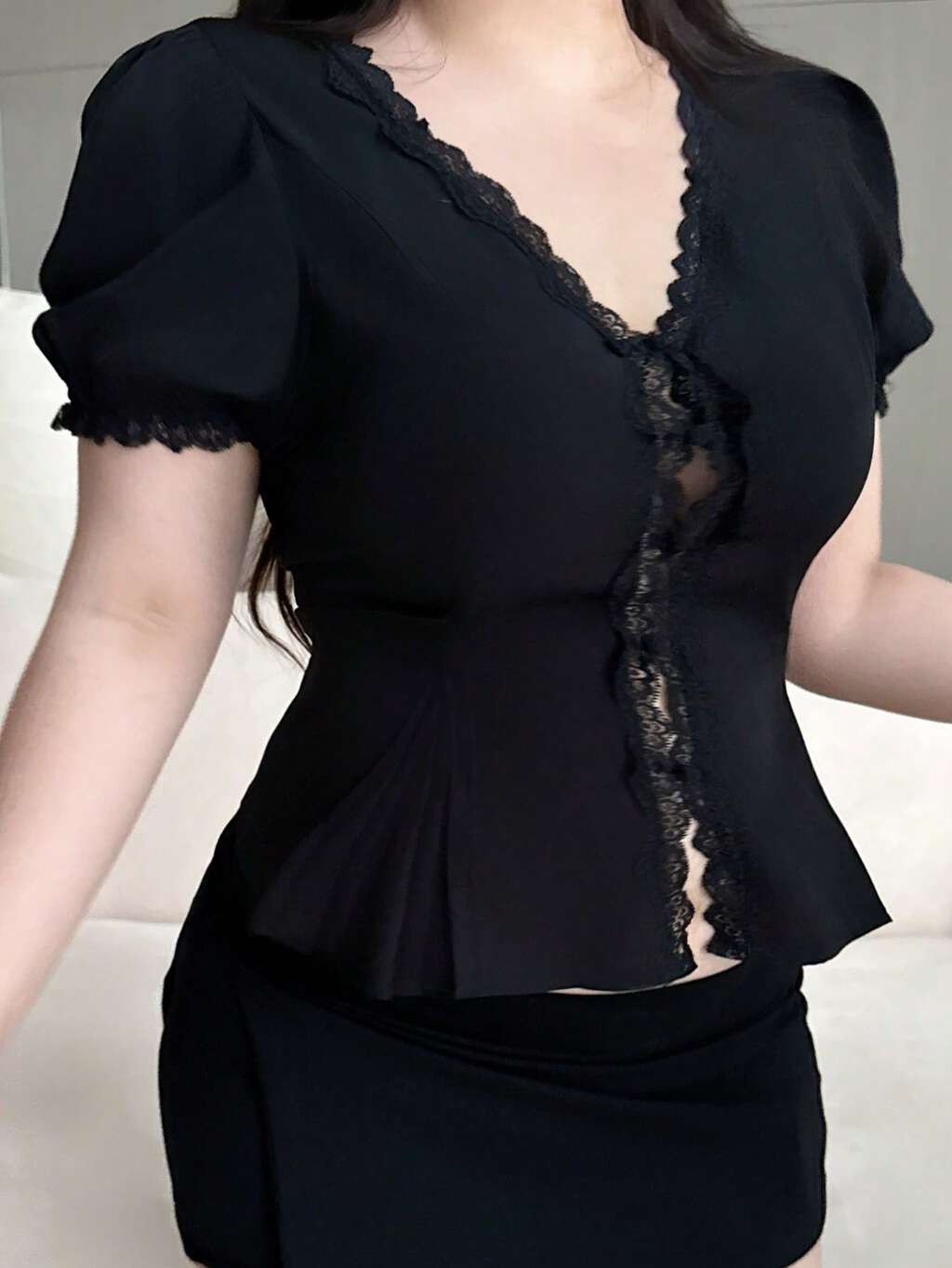 Dazy Plus Damen Große Größen Bluse mit tiefem V-Ausschnitt, Kontrast-Spitze, offener Vorderseite, geraffter Taille und Puffärmeln, sexy schwarze Bluse im Preppy-Stil