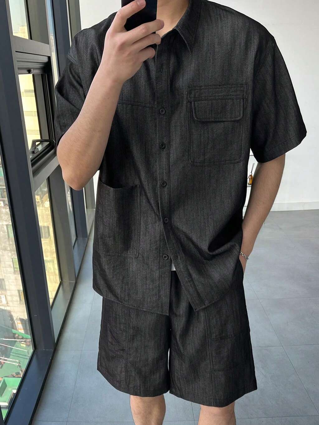 Conjunto de camiseta de manga corta gris holgada con botones y media cartera para hombre, de verano