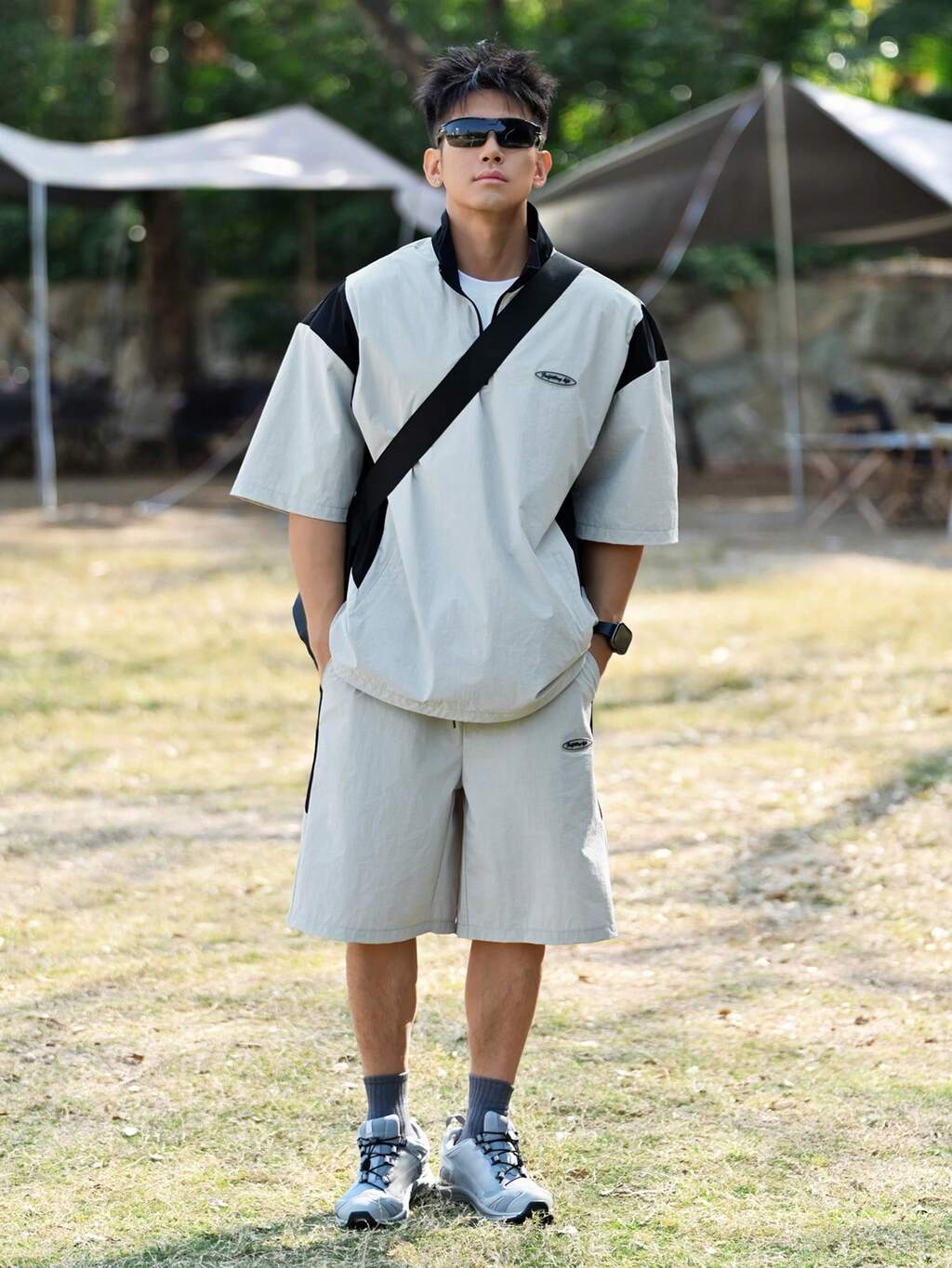 Conjunto de camiseta de exterior con cremallera y bloqueo de color para hombre, de verano