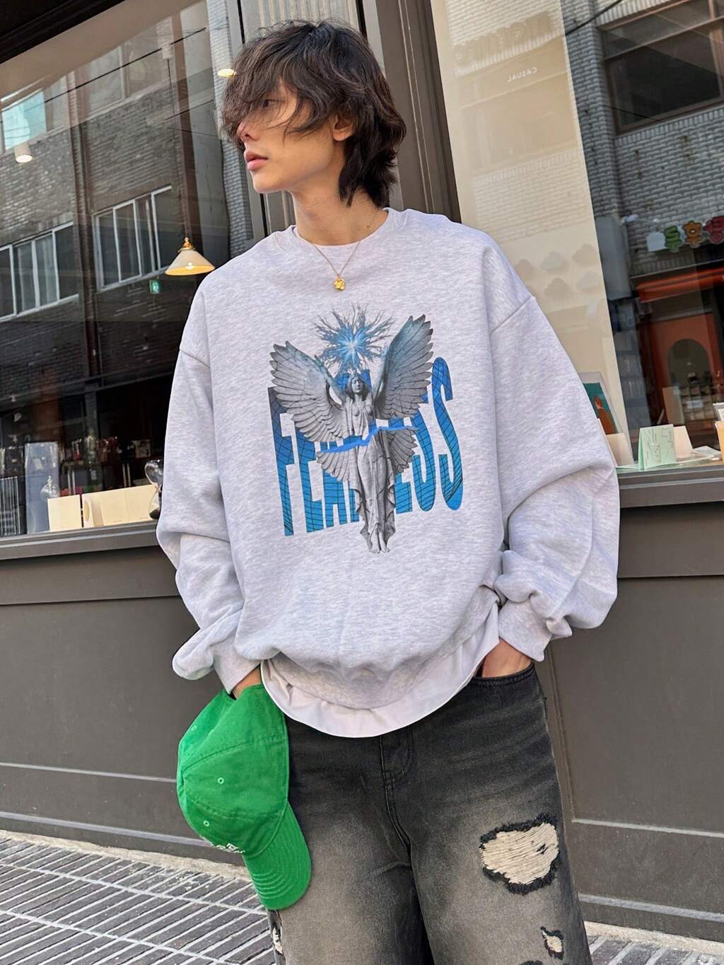 Sudadera casual con cuello redondo, manga larga y ajuste holgado con estampado de letras de ángel para hombre, otoño
