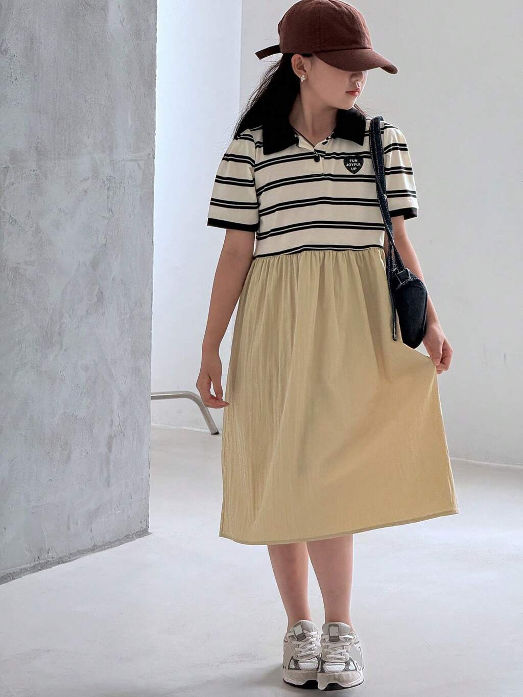 Vestido informal de manga corta holgado con parchwork a rayas para niñas preadolescentes, de verano