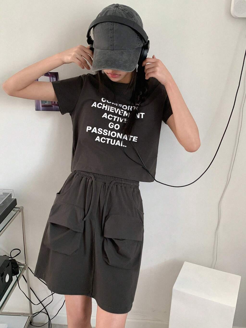 Set de 2 piezas de camiseta de manga corta con cuello redondo y pantalones cortos con estampado de logo para niñas preadolescentes