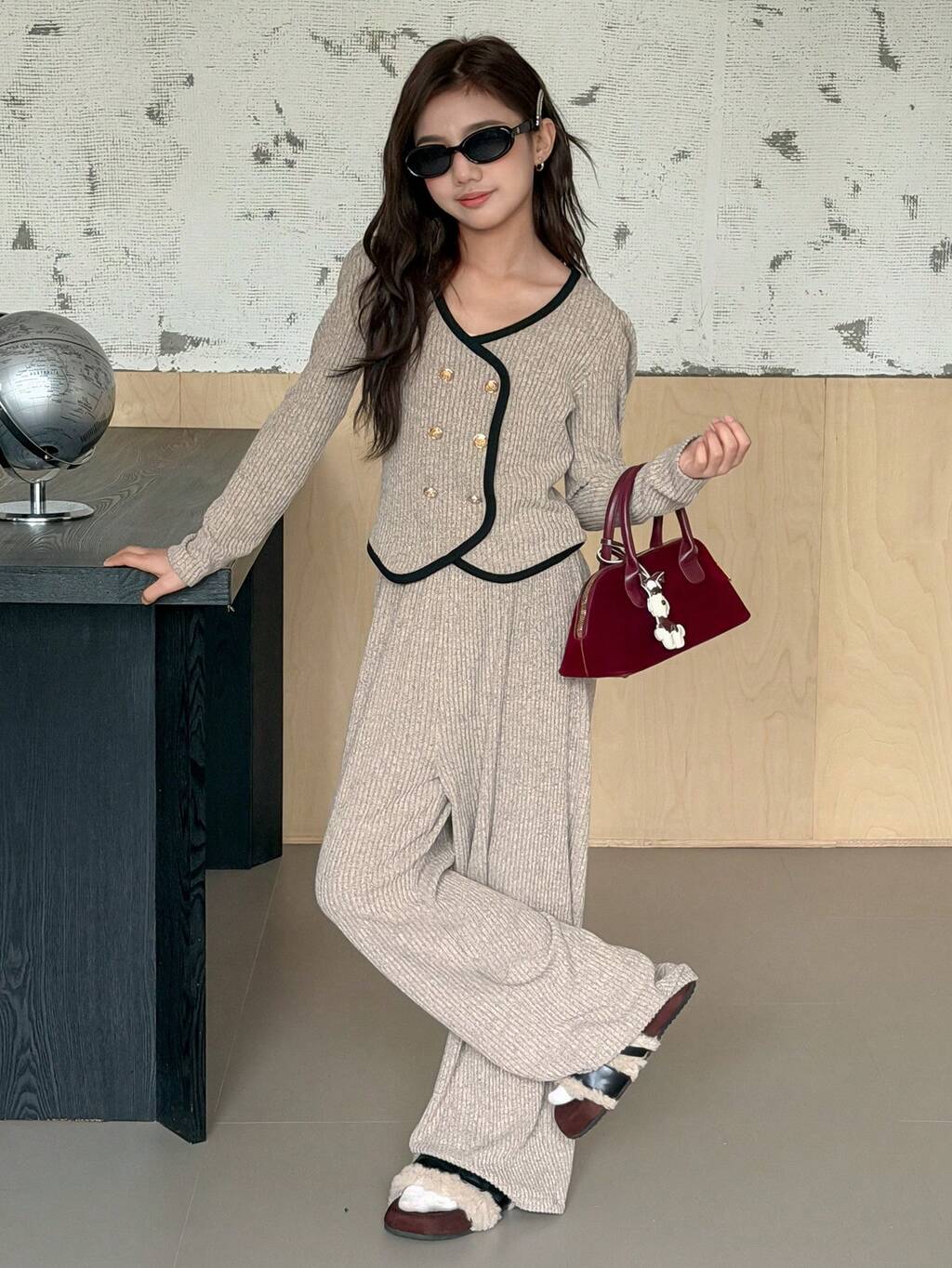 Conjunto de top de doble botonadura con ribete de contraste y pantalones de pierna ancha para niña preadolescente