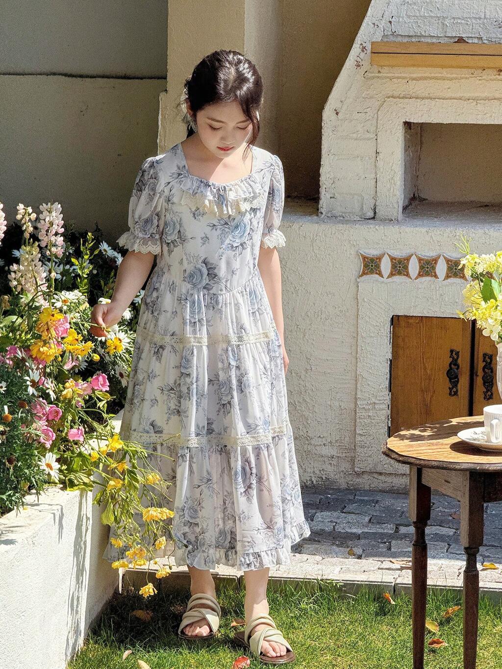 Vestido de niña preadolescente con cuello cuadrado y manga corta con estampado floral diminuto, para verano, regreso a clases, vacaciones y Pascua