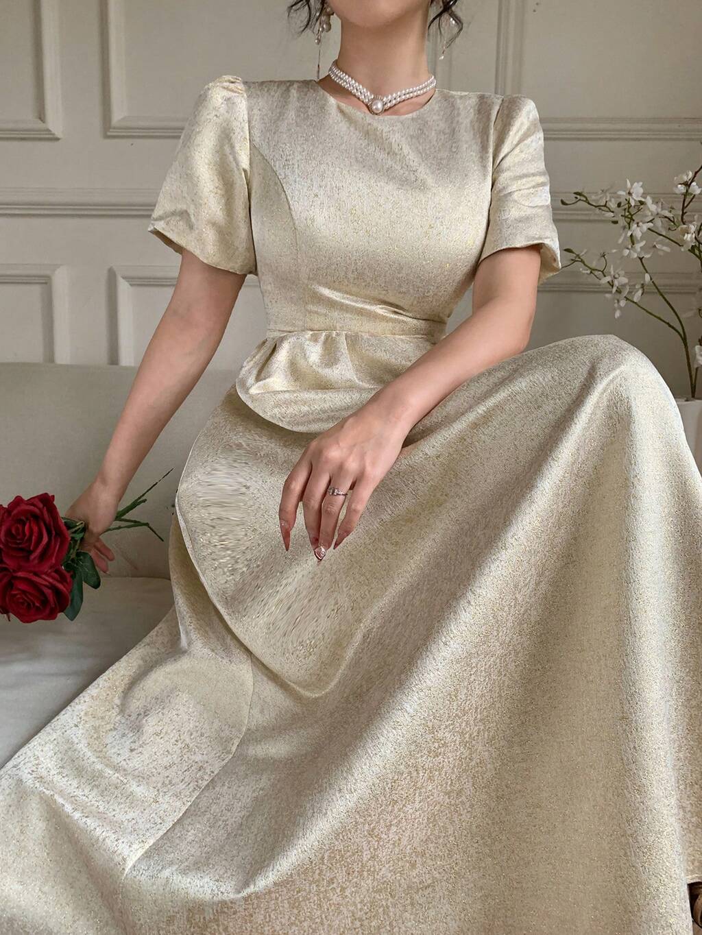 Vestido elegante de mujer con cuello redondo y mangas abullonadas