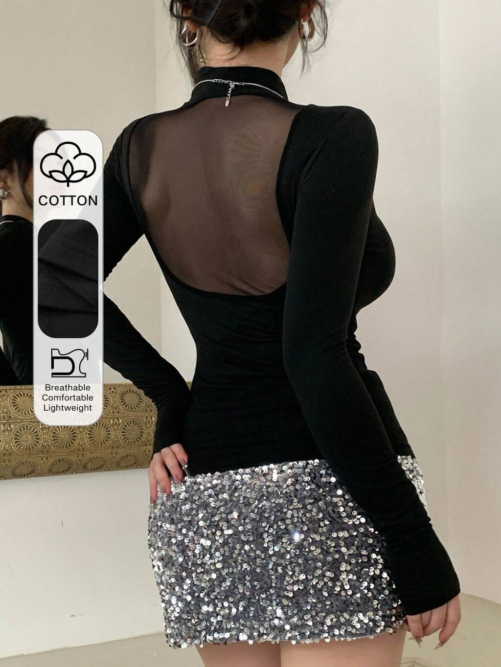 Top de mujer de manga larga, de unicolor, con malla y envolvente, sexy y corto