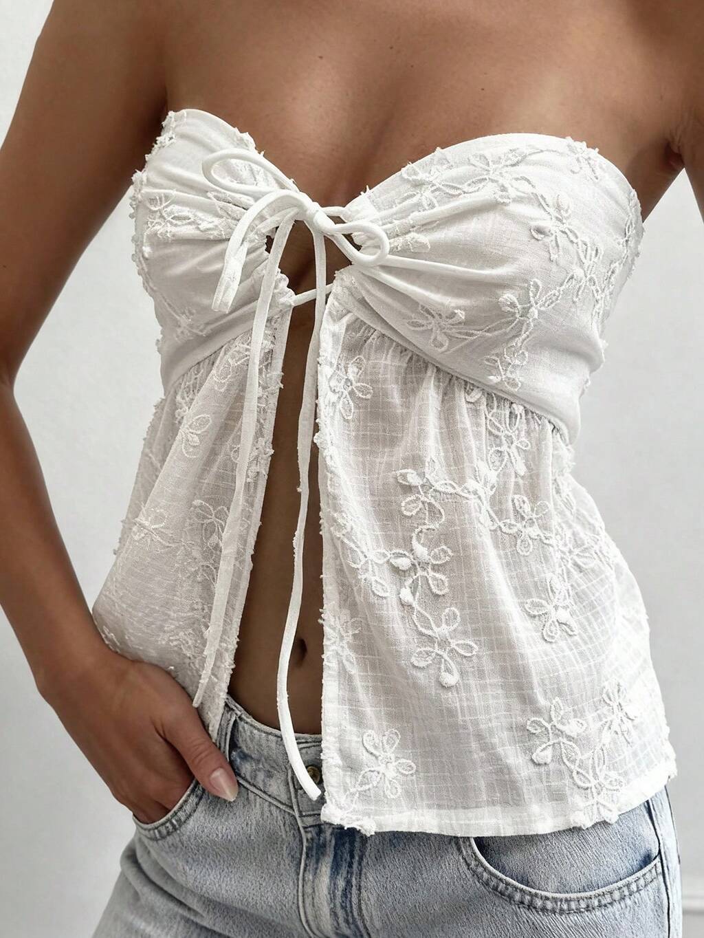 Blusa holgada de estilo bohemio con mangas 3/4, unicolor, jacquard, calada, con lazo y borlas, para vacaciones de primavera/verano