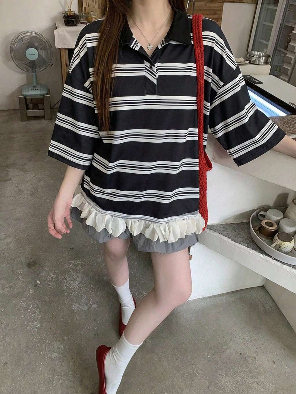 Camisa polo de chifón con parches de encaje a rayas y contraste de colores, estilo casual de vacaciones de manga corta para mujer
