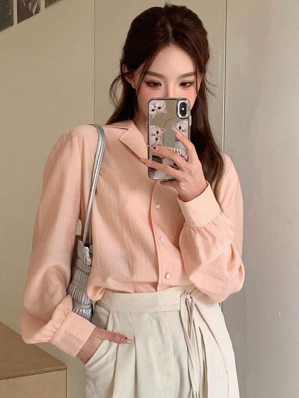 Camisa de botones para mujer con cuello, manga larga, ajuste suelto, elegante y encantadora, de buen carácter y gracia