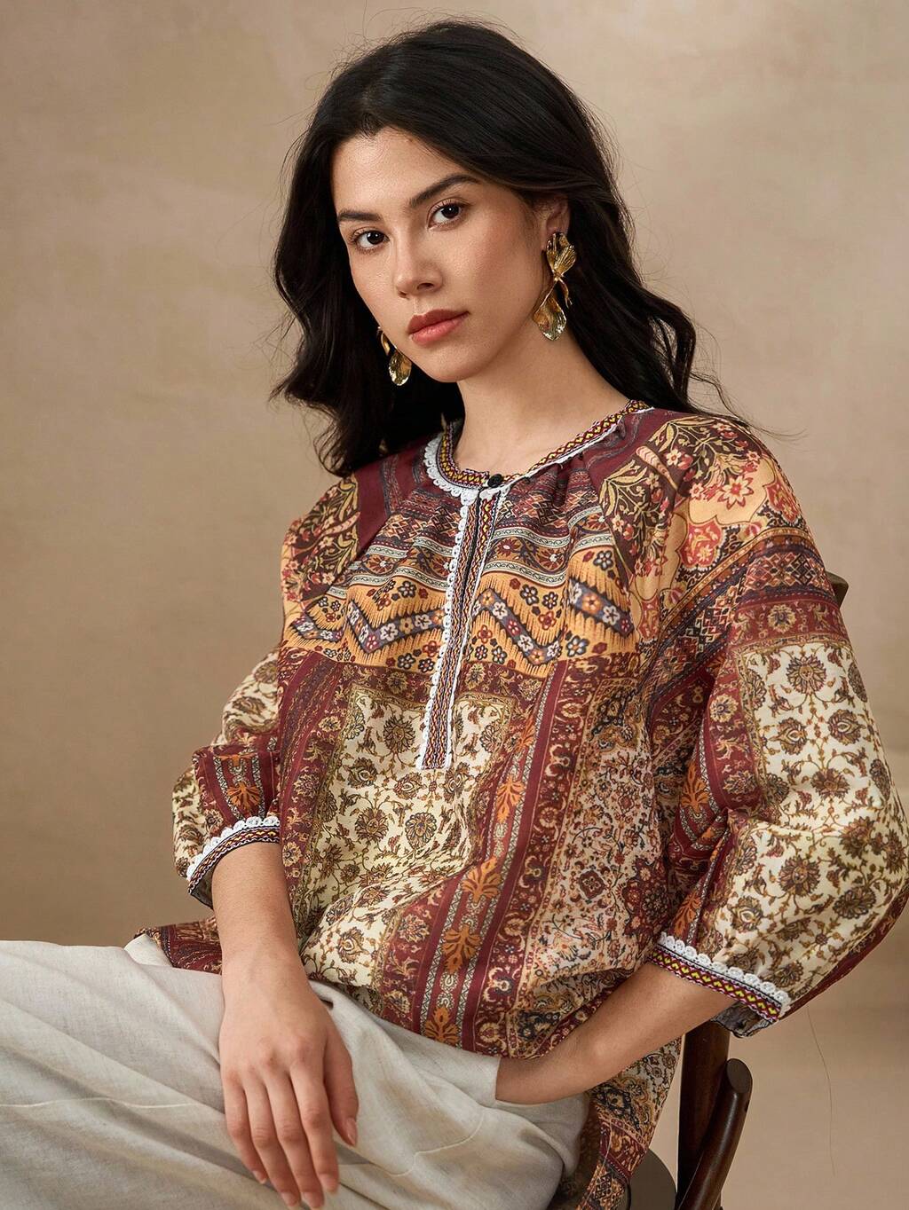 Blusa holgada de estilo casual de vacaciones con estampado de patchwork y mangas raglán, primavera/verano/otoño bohemio