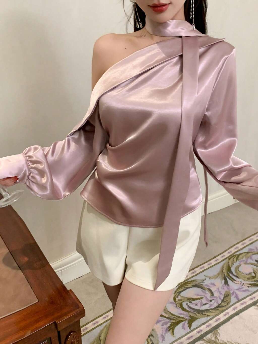 Blusa de cuello asimétrico ribete con fruncido