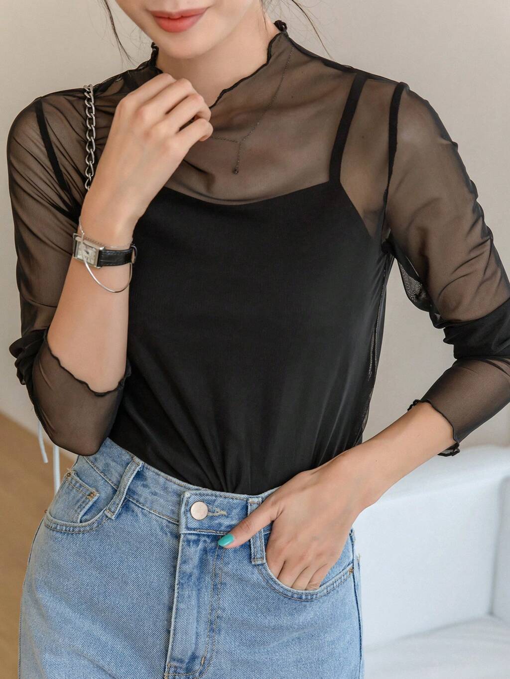 Blusa de manga larga transparente con textura de malla, ropa de otoño para mujer