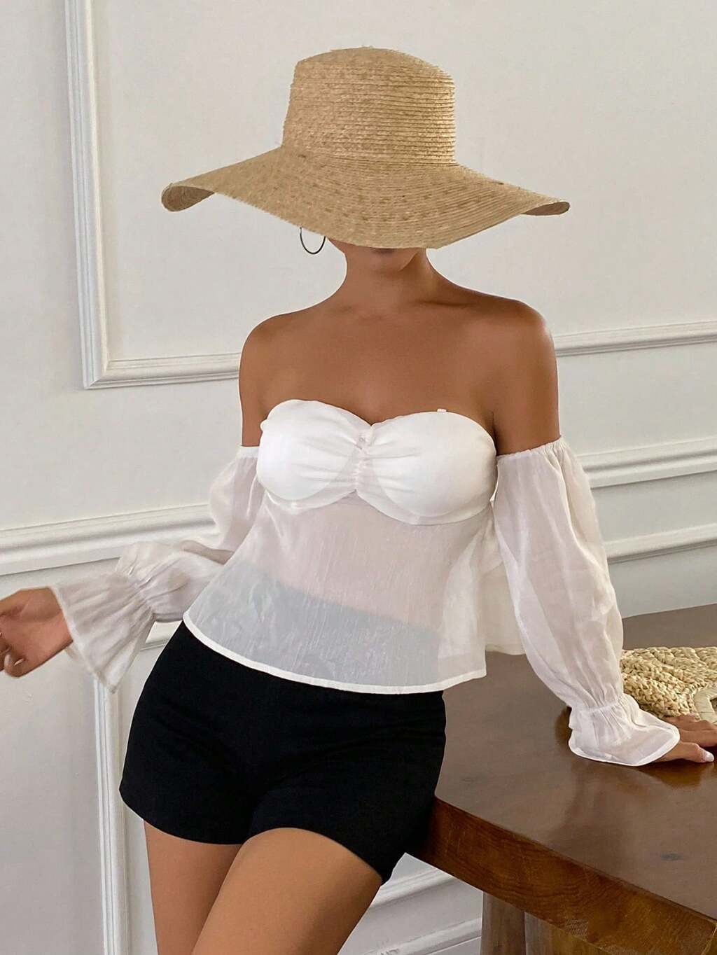 Camisa de mujer de hombros descubiertos en color albaricoque con pliegues y mangas abultadas, textura adecuada para vacaciones de primavera/verano y boda