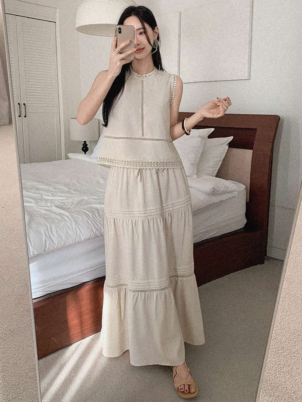 Conjunto de 2 piezas de estilo bohemio para vacaciones con top sin mangas y falda larga para mujer