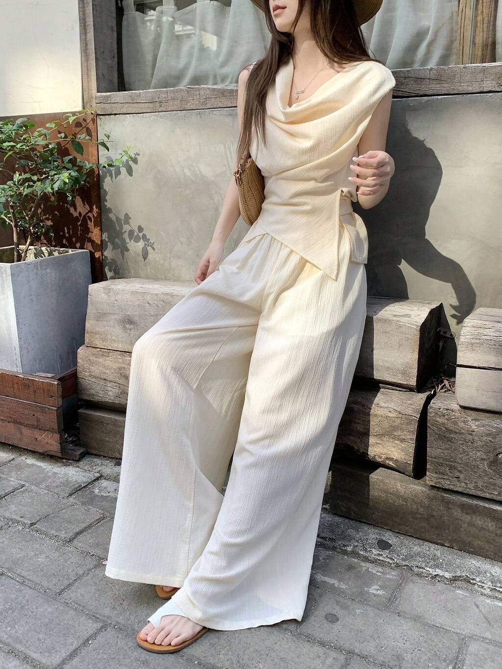 Conjunto de 2 piezas de estilo vintage minimalista para primavera y verano para mujer, con top corto sin mangas + pantalones de pierna ancha