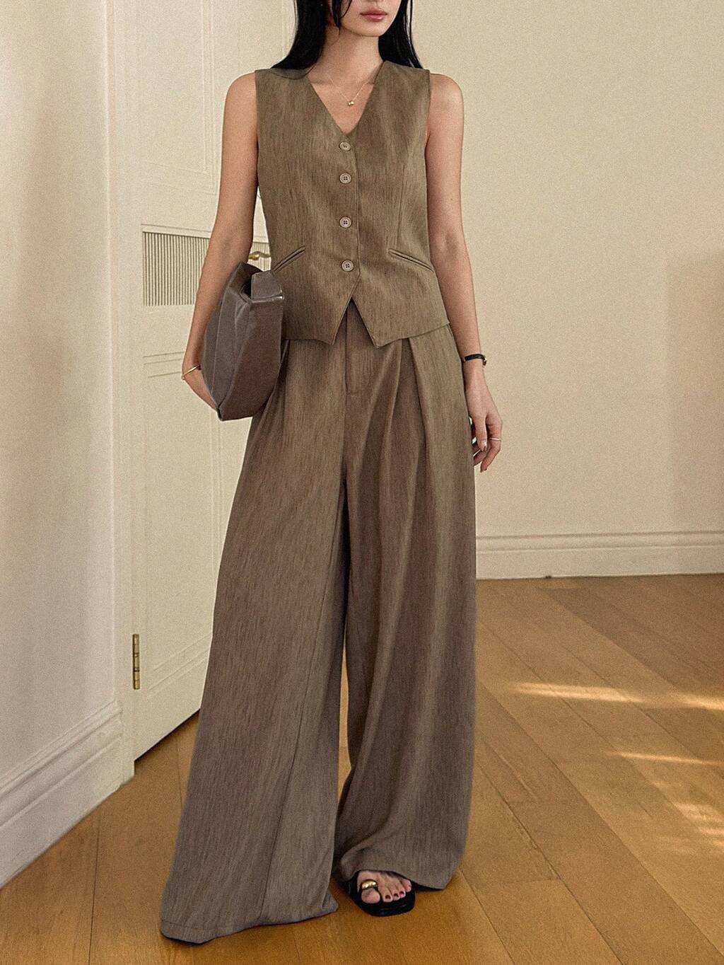 Conjunto casual de 2 piezas con cárdigan sin mangas de cuello en V y pantalones rectos plisados holgados para mujer