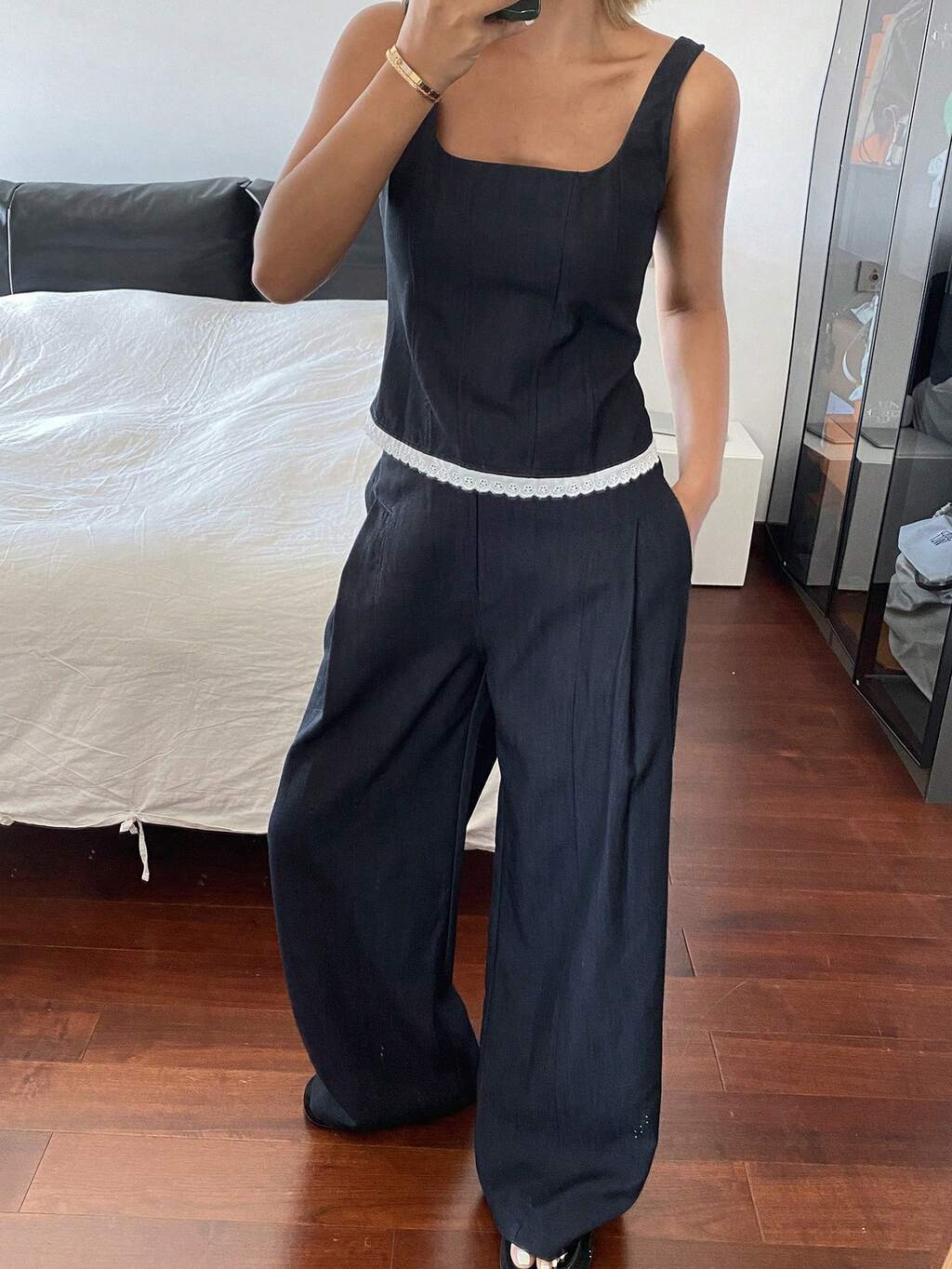Conjunto de 2 piezas de top transparente de encaje con cuello redondo y pantalones de pierna ancha con bolsillos inclinados drapeados, para verano