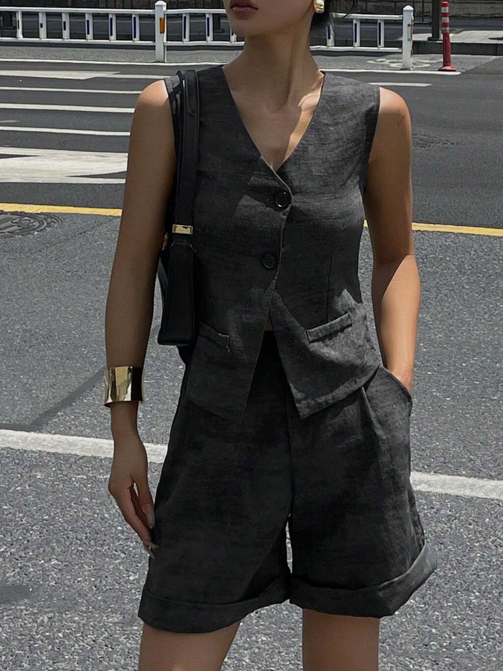 Conjunto de 2 piezas de estilo de negocios casual de lino para mujer, con top tipo chaleco de diseño de moneda vintage y pantalones holgados minimalistas para el verano