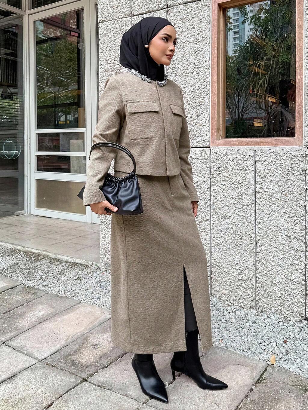 Conjunto de 2 piezas de chaqueta con bolsillos con tachuelas y falda con abertura, moda modesta de otoño para mujer