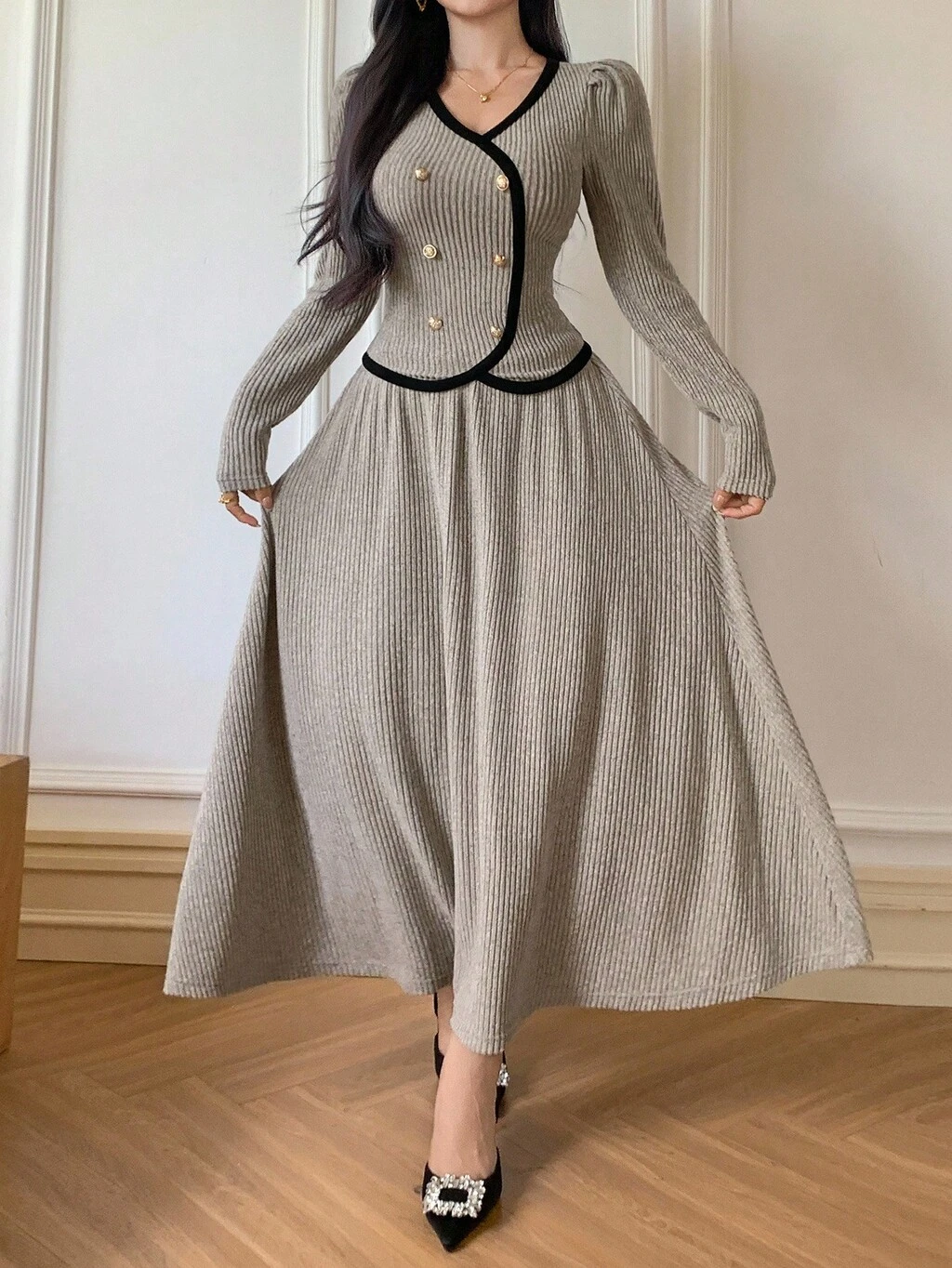 Vestido de noche elegante y vintage de lujo con manga larga, volantes en el bajo y abertura, conjunto de vestido ajustado, vestido de gala negro