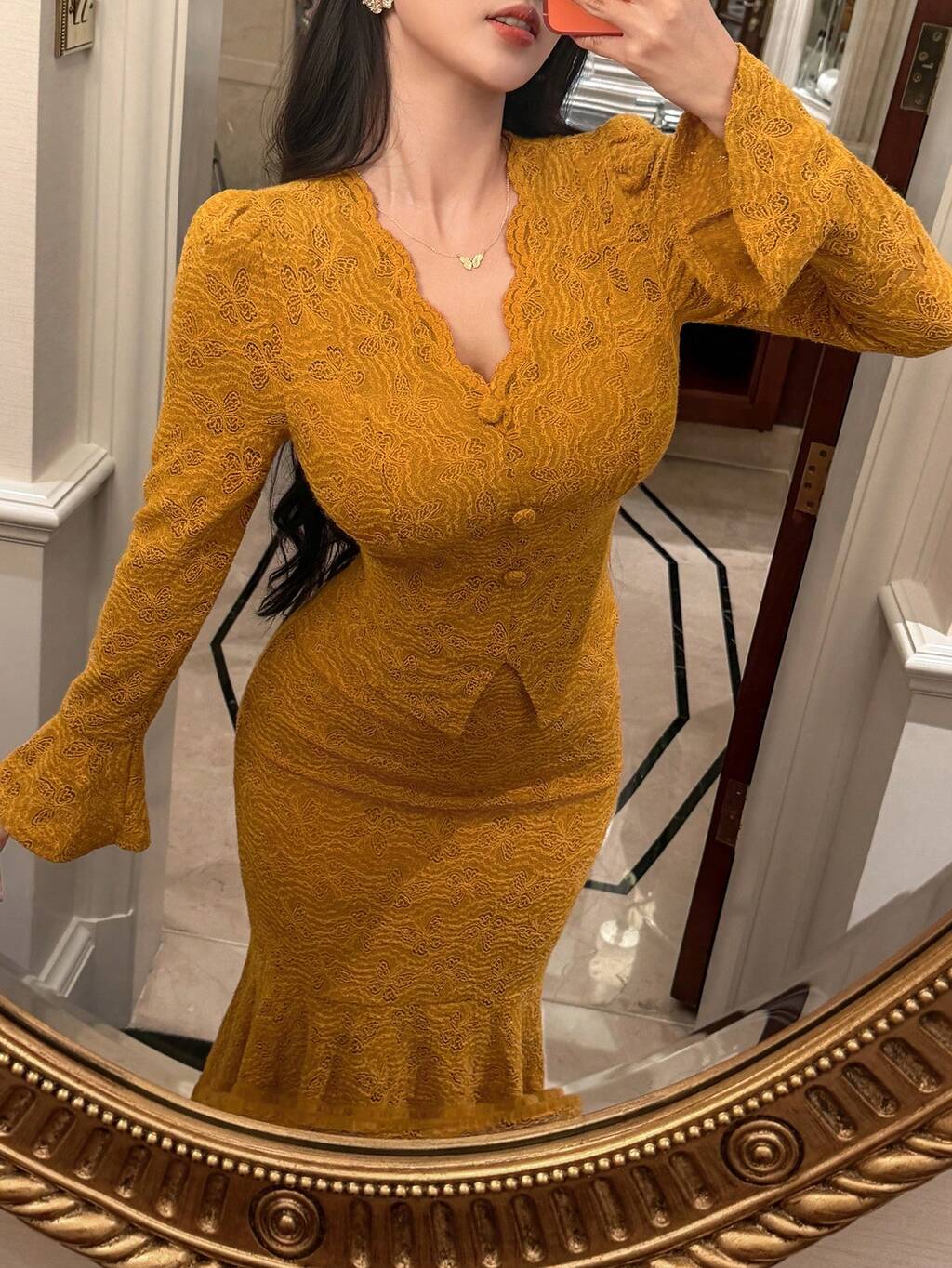 Elegante vestido de sirena con estilo francés de encaje, con escote en V y mangas acampanadas, un conjunto de vestido elegante y grácil
