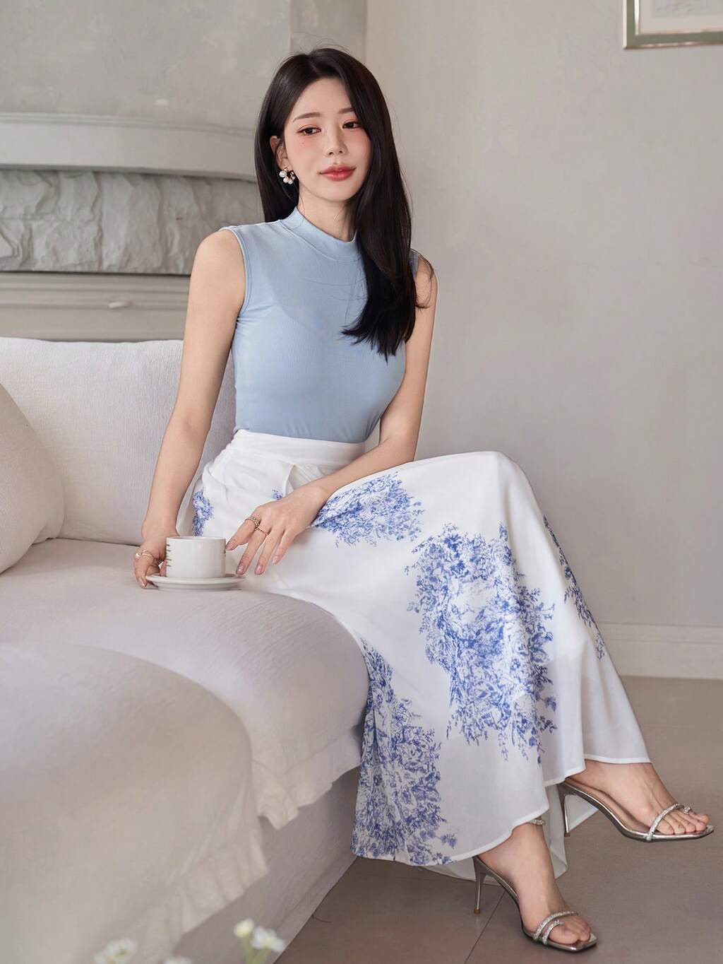 Conjunto de 2 piezas de mujer con top sin mangas de unicolor con cuello alto elegante y falda estampada floral en línea A, para invitada de boda, verano y primavera
