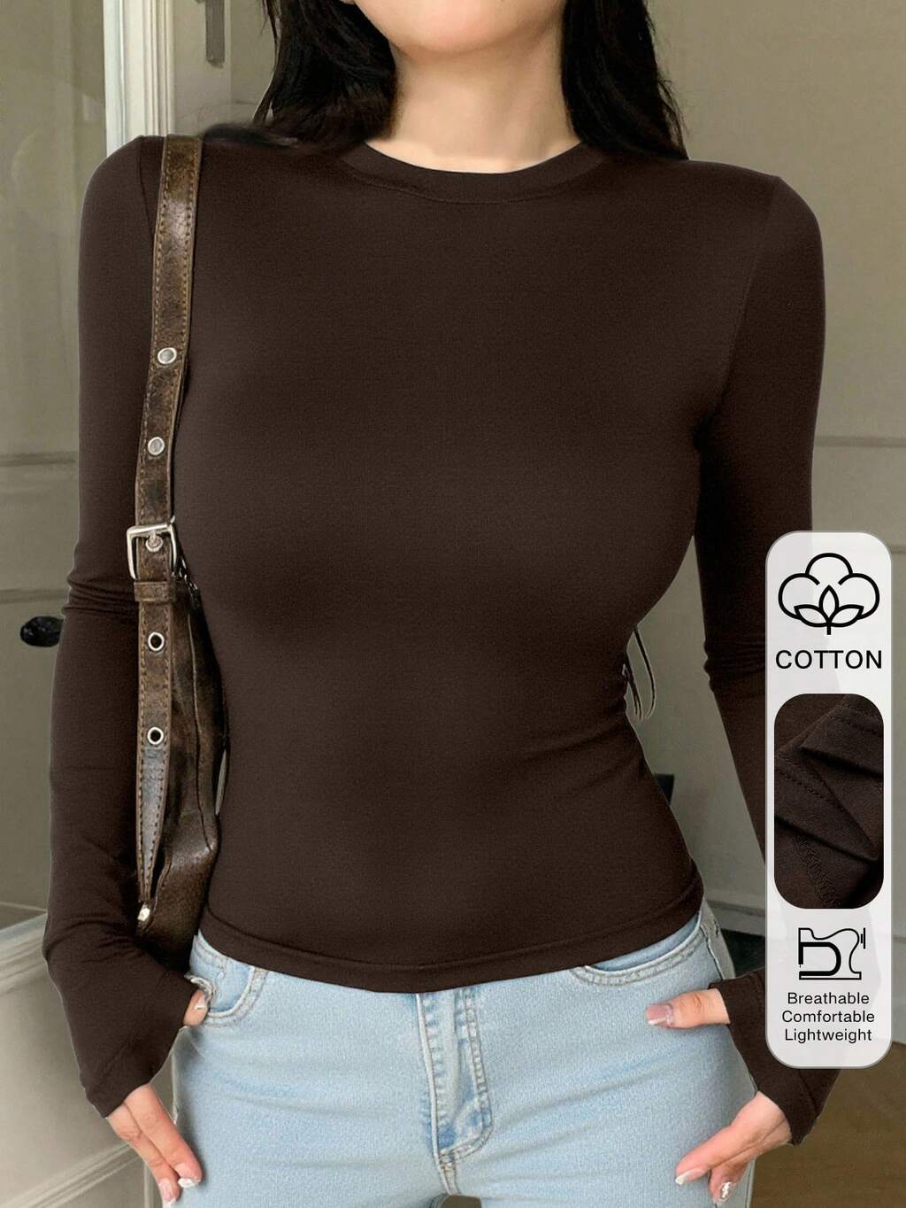 Camiseta de manga larga de cuello redondo ajustada de unicolor para mujer, versátil