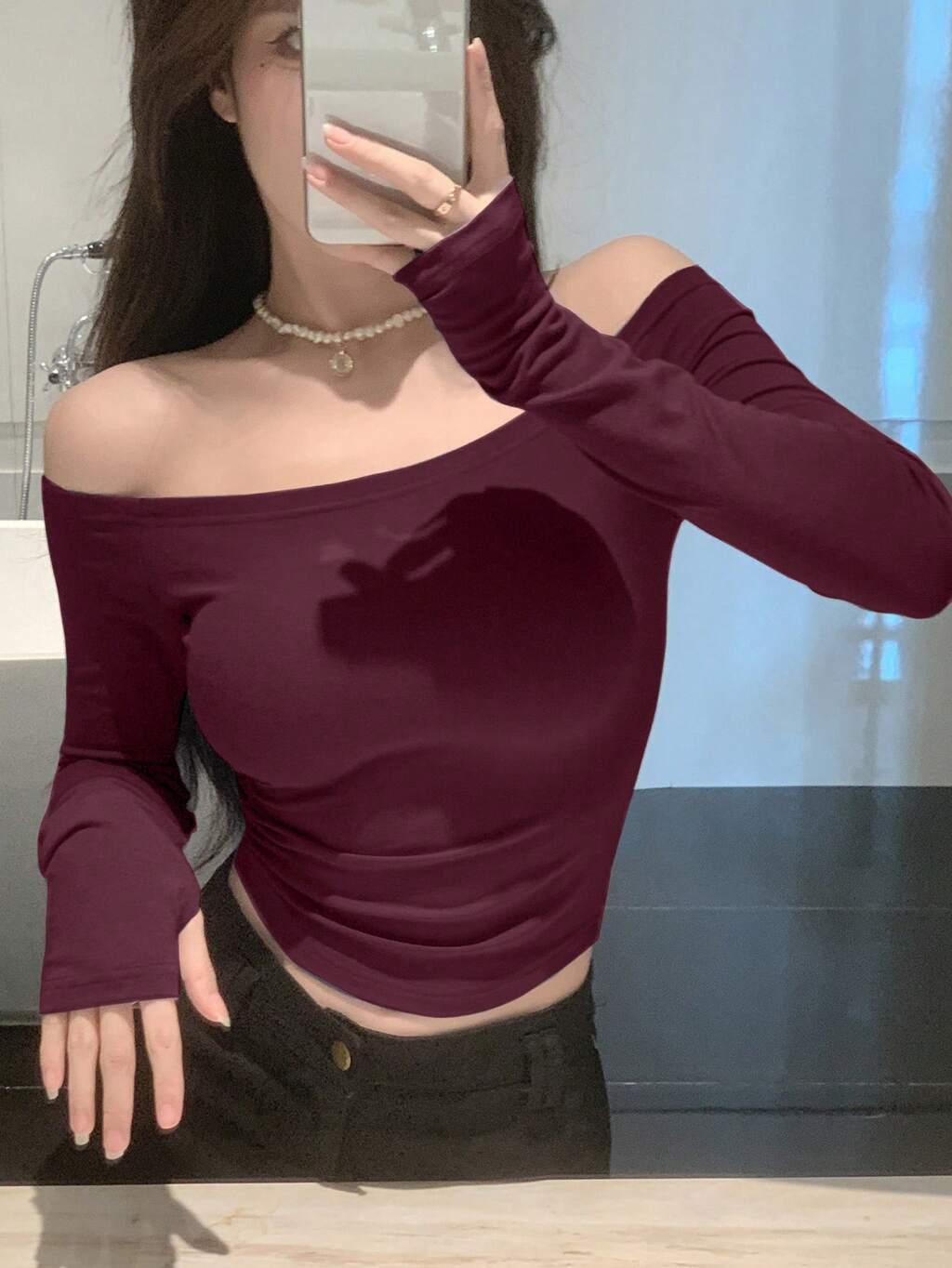 Camiseta ajustada de hombros descubiertos para mujer, para Año Nuevo Chino, primavera/verano, otoño, manga larga, para salir