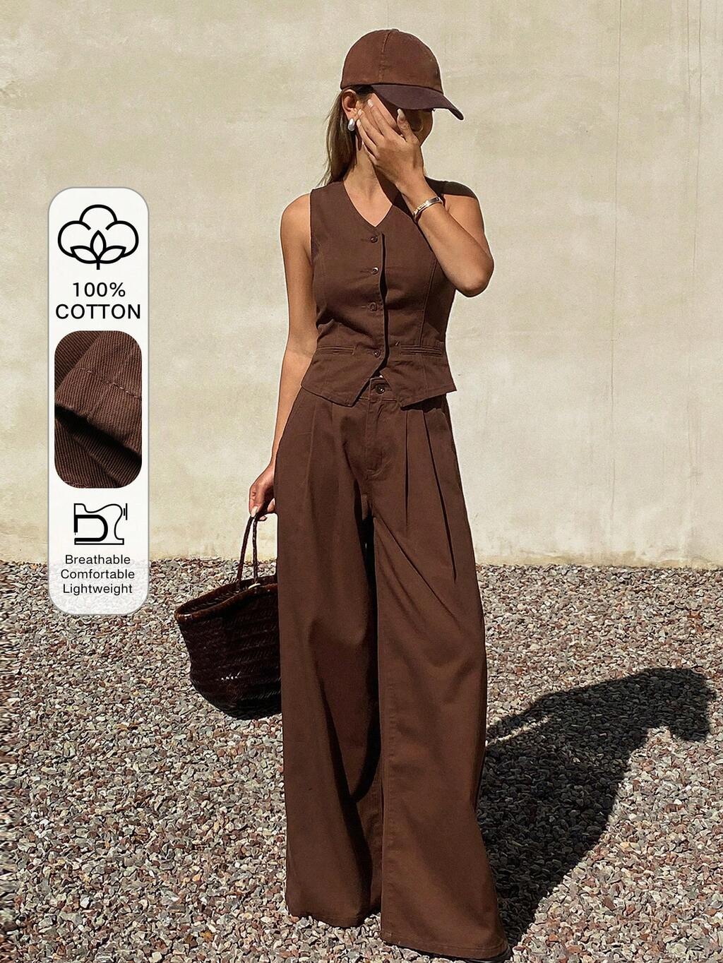 Conjunto de mezclilla informal para mujer con chaleco de mezclilla sin mangas de cuello en V y pantalones rectos
