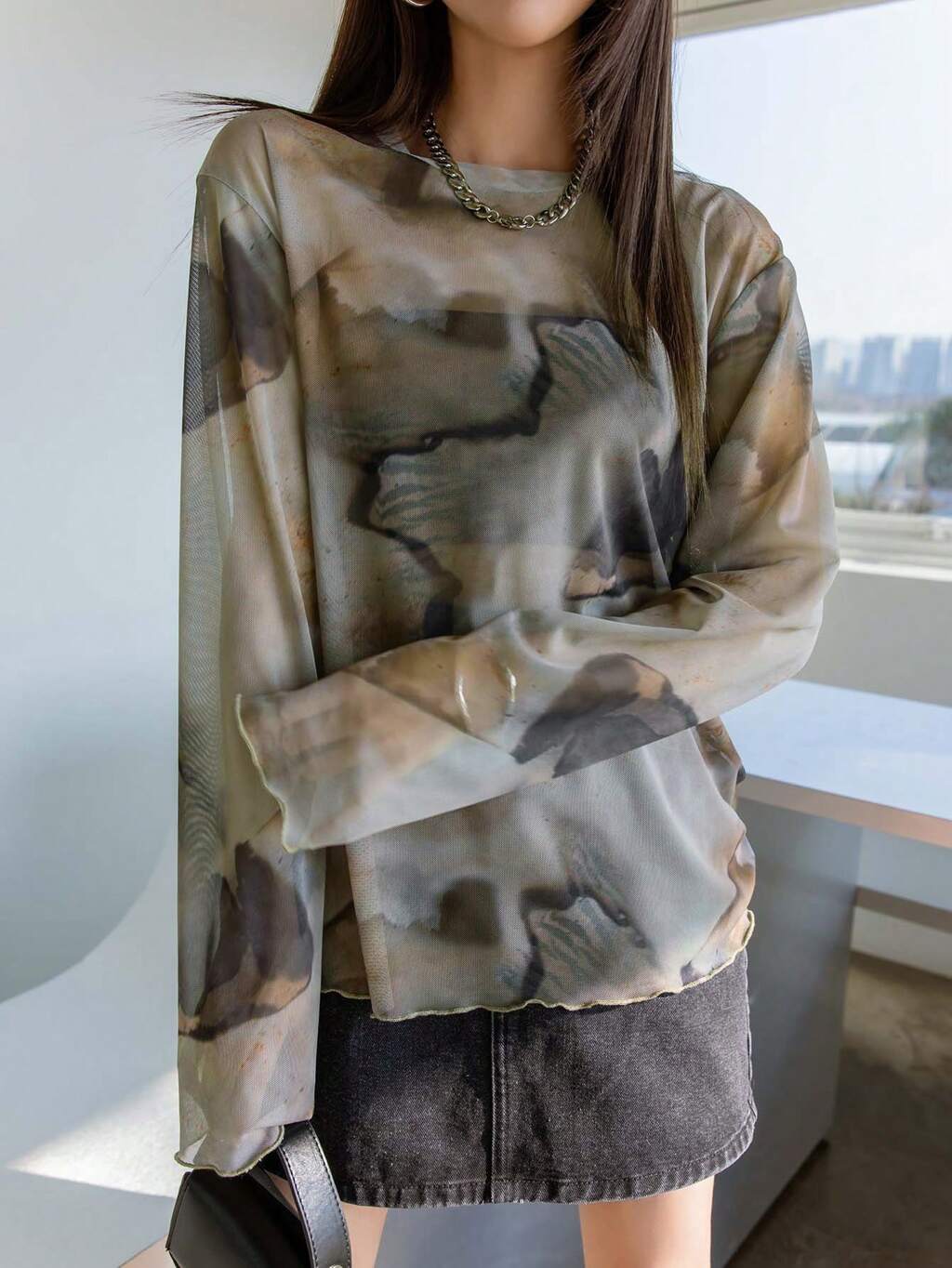 Parte superior de mujer de manga larga transparente con hombros caídos y efecto tie-dye, sin top bandeau