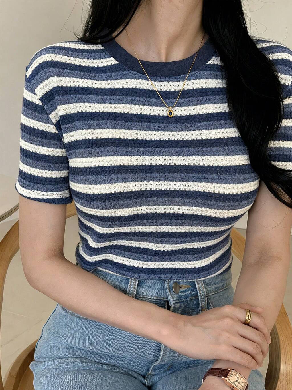 Blusa de mujer con textura a rayas en azul y blanco, con bloques de color contrastante, cuello redondo y manga corta, para uso casual de oficina y trayecto, primavera/verano